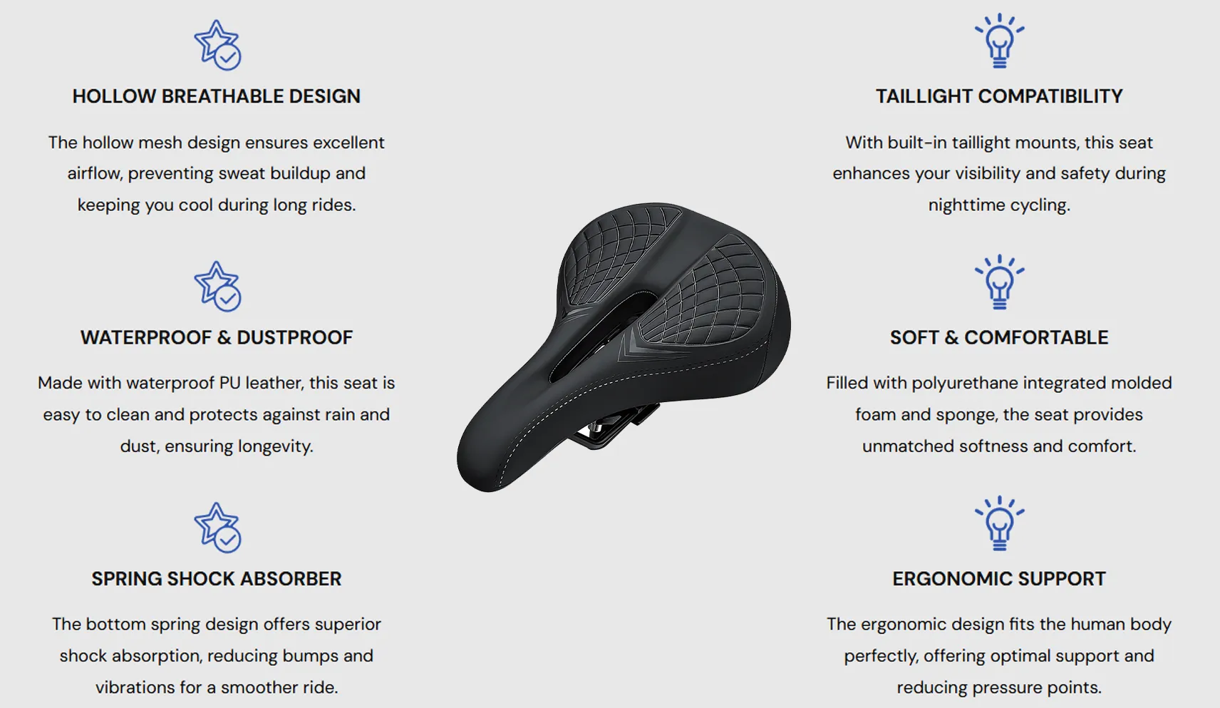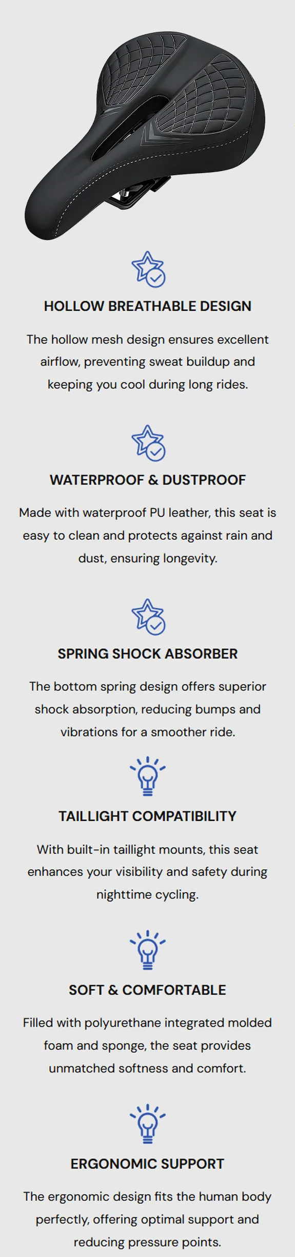 - Soft Comfortable Padding - PU foam and sponge absorb shocks for a smoother ride.